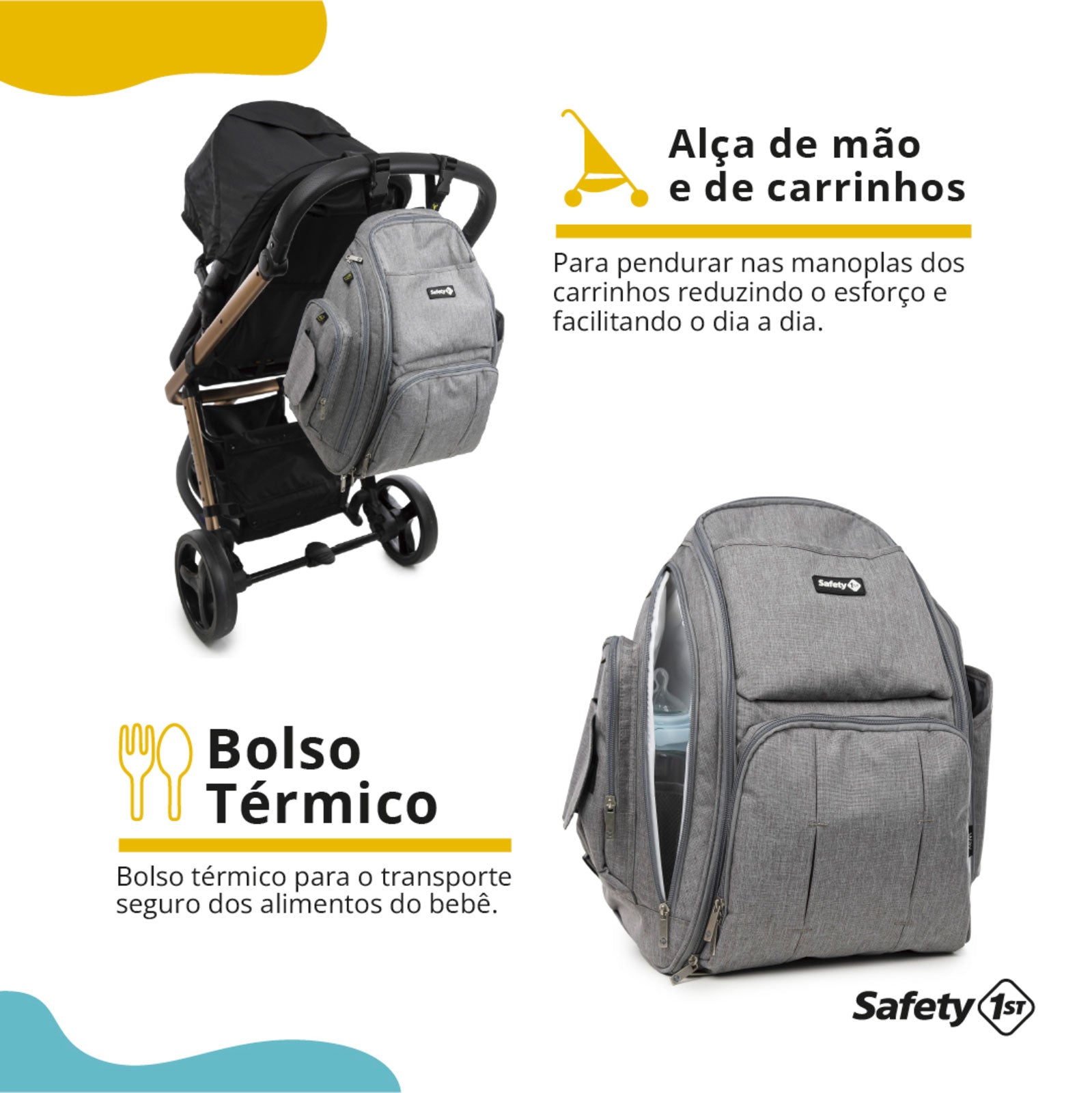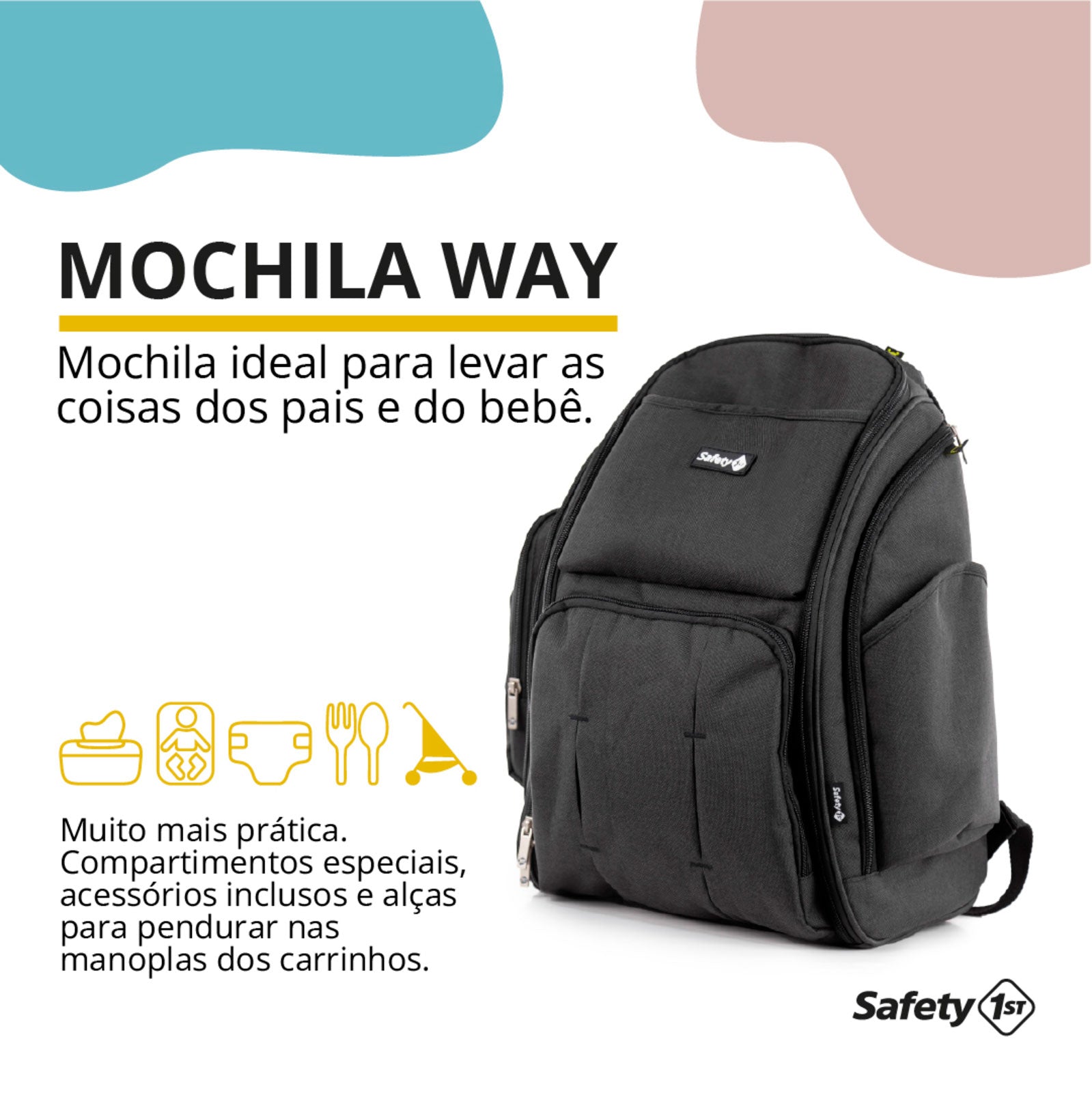 Super companheira das mães e dos pais, a Way é super prática: tem tiras de velcro para prender na manopla da maioria dos carrinhos e também alça para carregar na mão. E o conforto não fica para trás: as alças e a parte de trás da mochila (que fica em contato com as contas do adulto) são acolchoadas e feitas em tecido respirável.