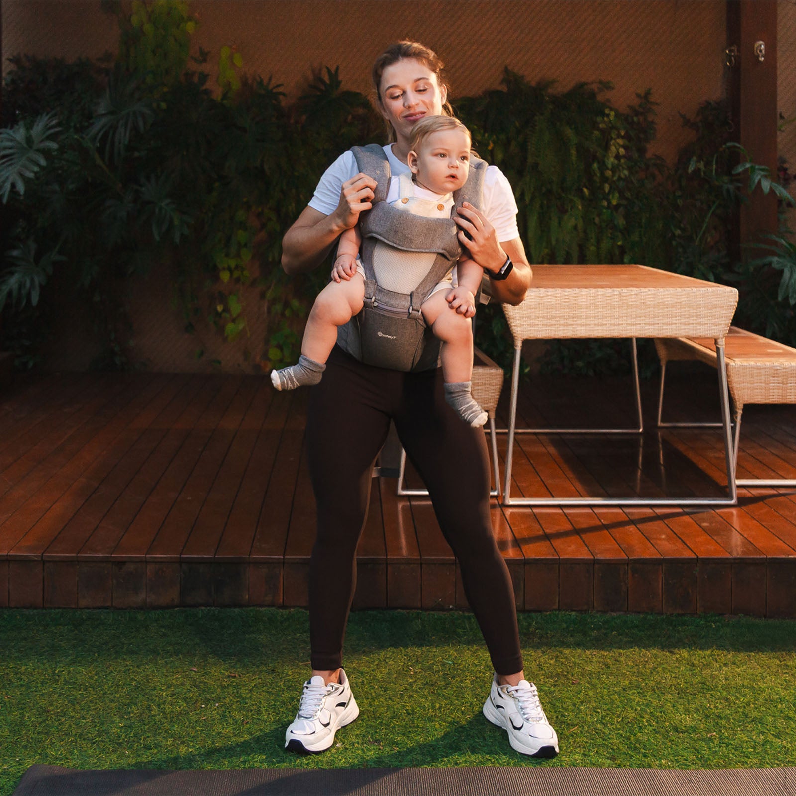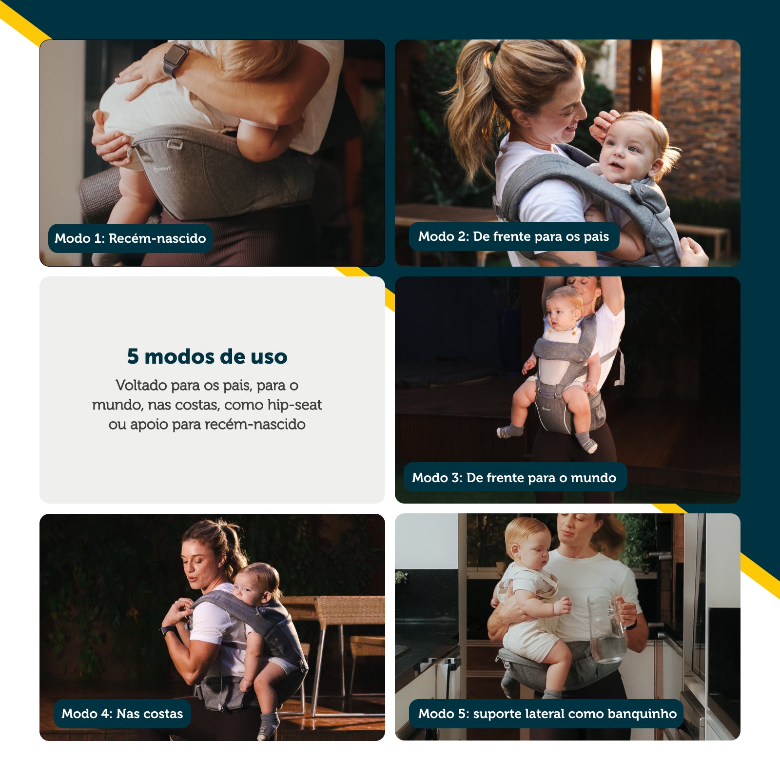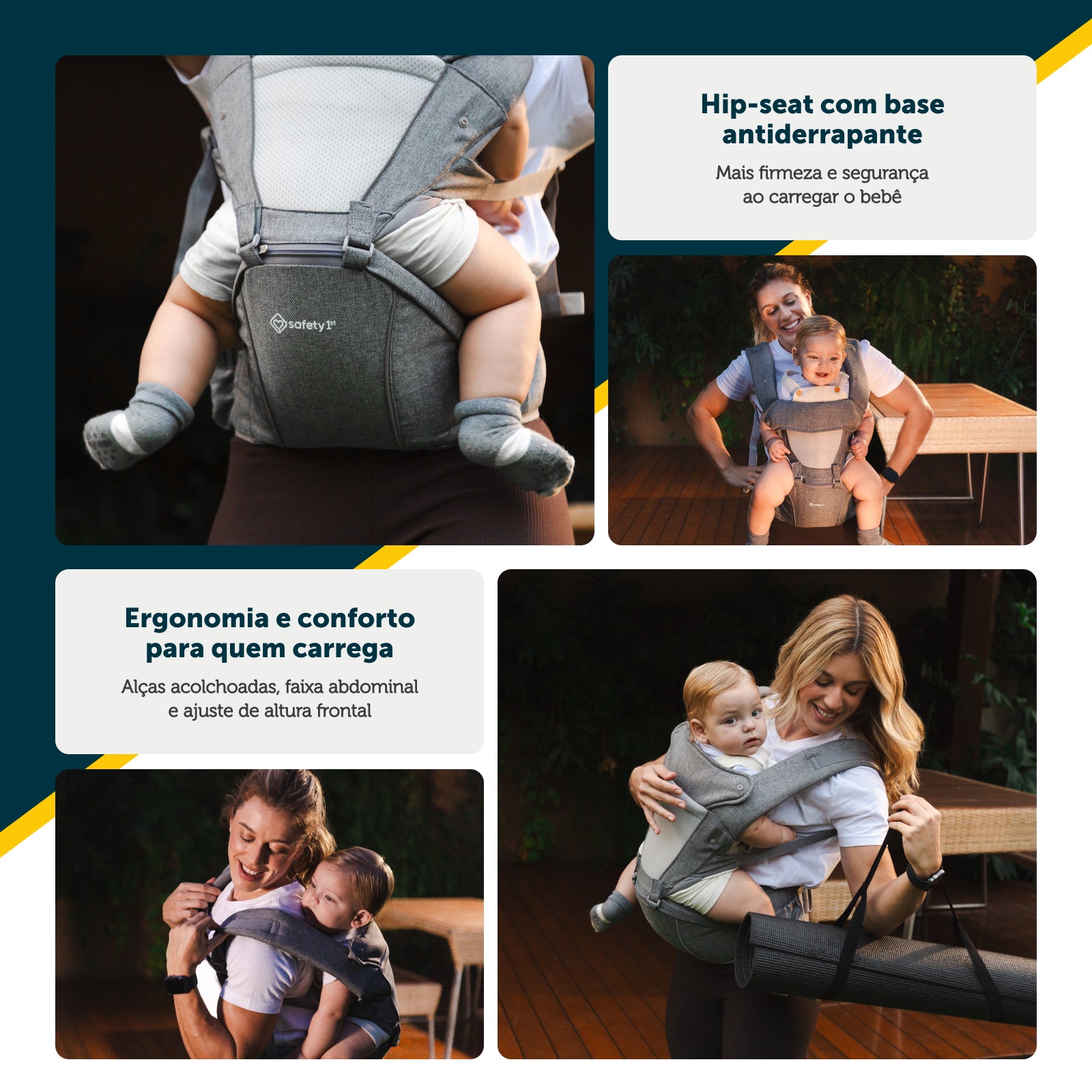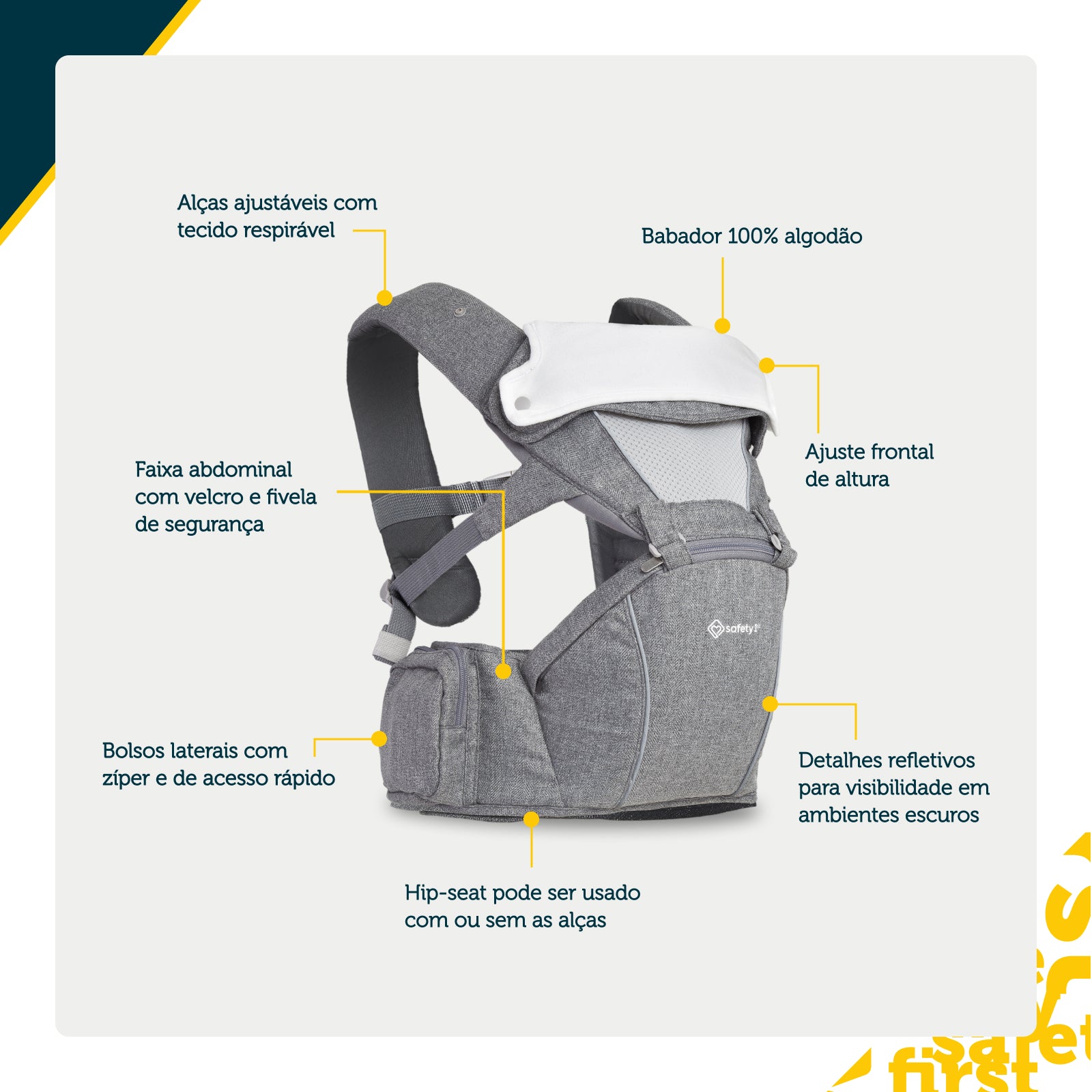 O hip-seat, que pode ser adquirido separadamente, funciona como um apoio firme para carregar o bebê com segurança em passeios curtos, deslocamentos rápidos ou dentro de casa. Pode ser usado sem as alças, garantindo mais mobilidade e menos volume.