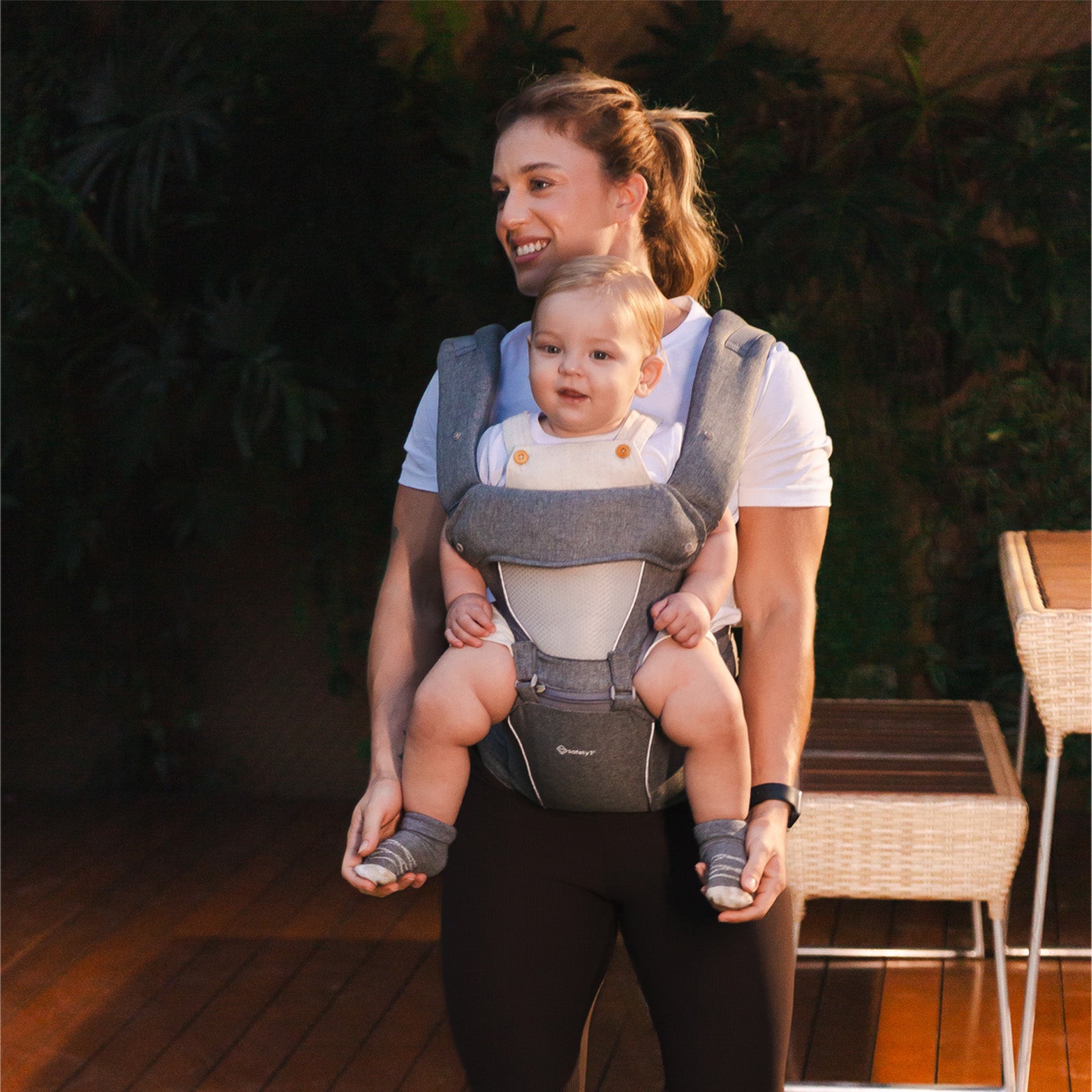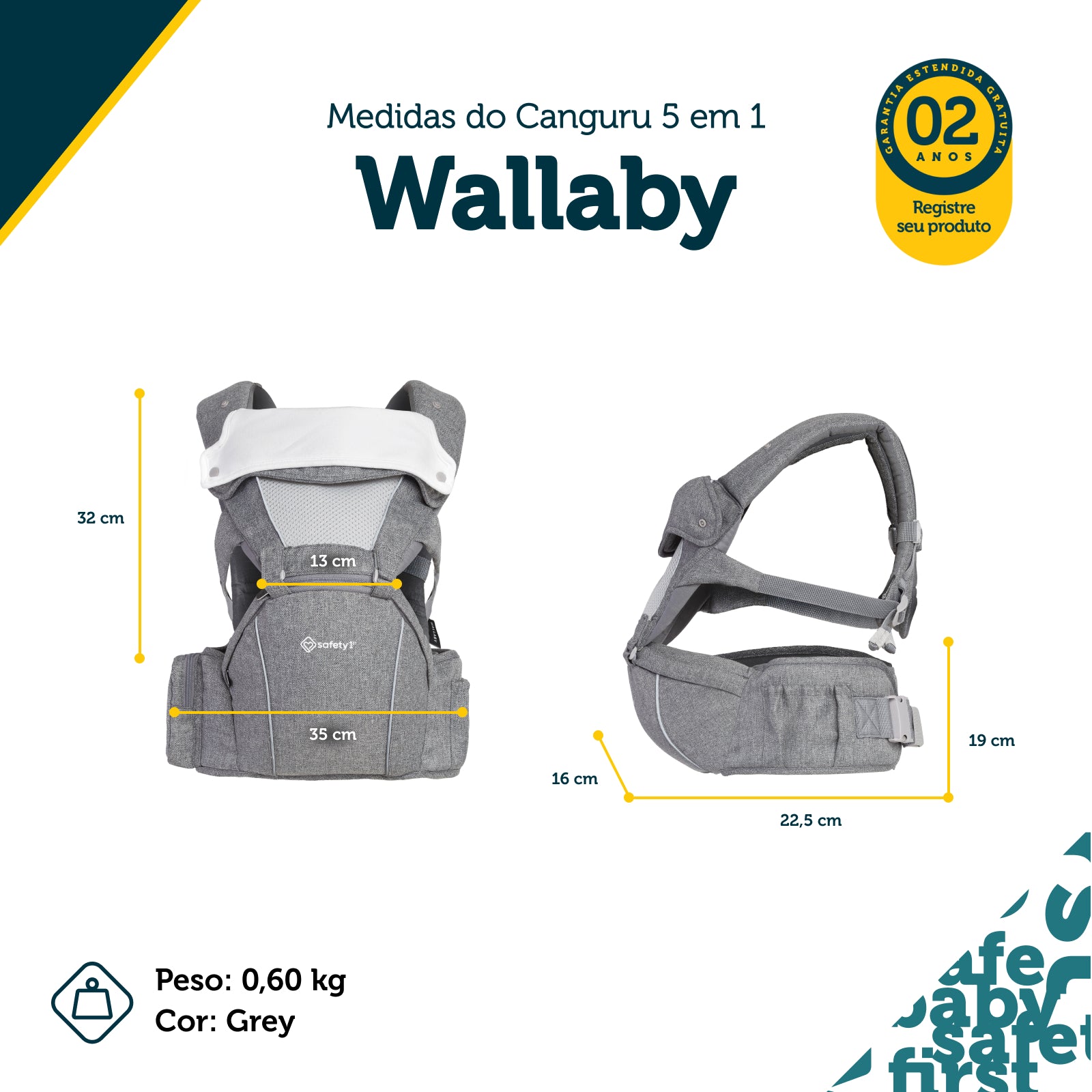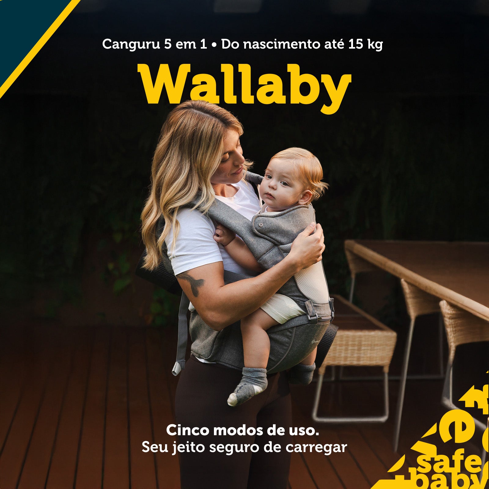 O Wallaby é o primeiro canguru da Safety 1st com 5 modos de uso. Ele funciona como canguru completo ou apenas como assento hip-seat, acompanhando diferentes fases da criança e jeitos de carregar.