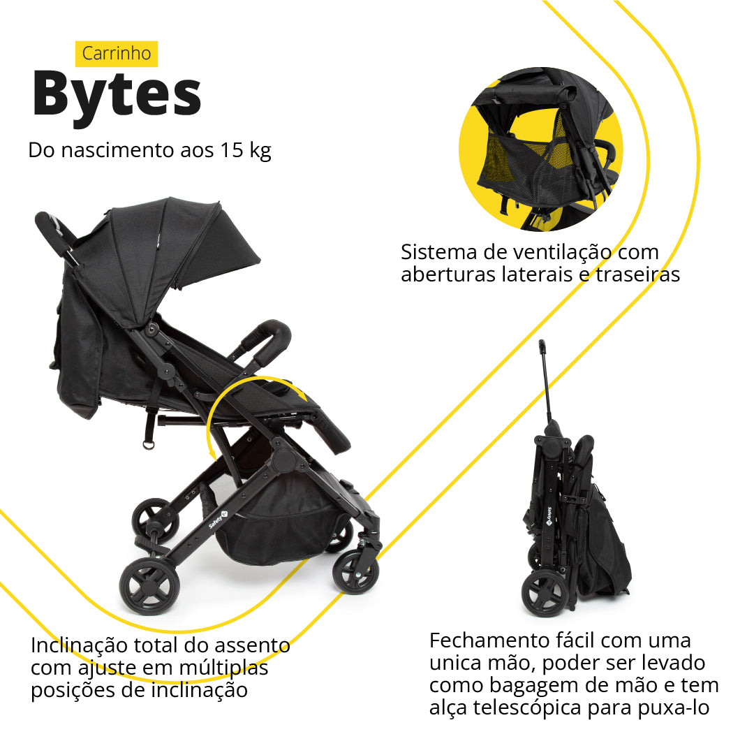 Produtos práticos e funcionais facilitam muito o dia a dia das famílias com bebês e crianças pequenas e o carrinho Bytes cai como uma luva na rotina dos pais e cuidadores. Ele tem fechamento compacto com alça telescópica para levar como uma mala de rodinhas, com muita tranquilidade.