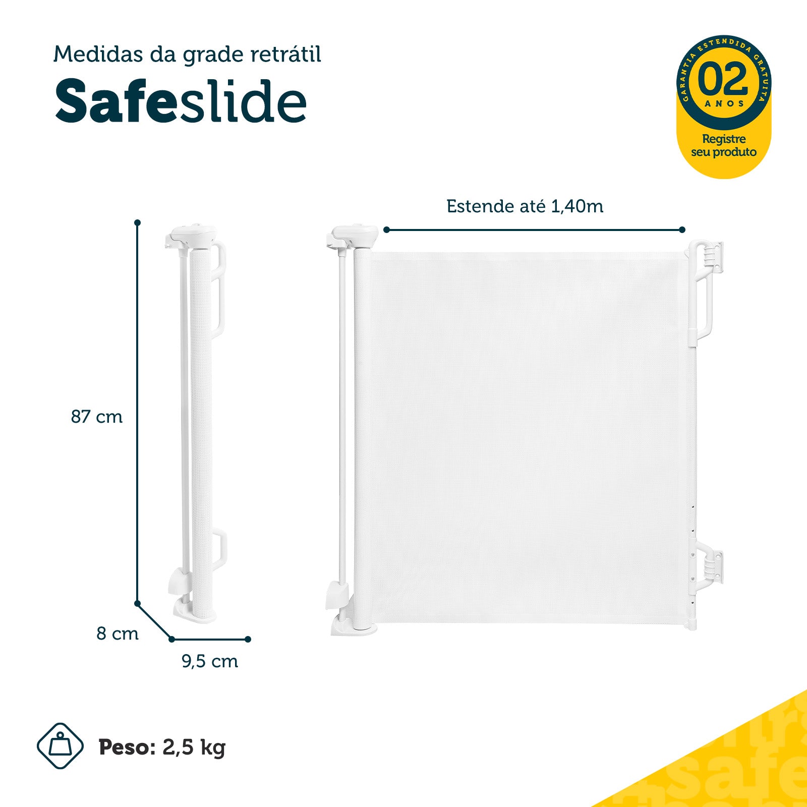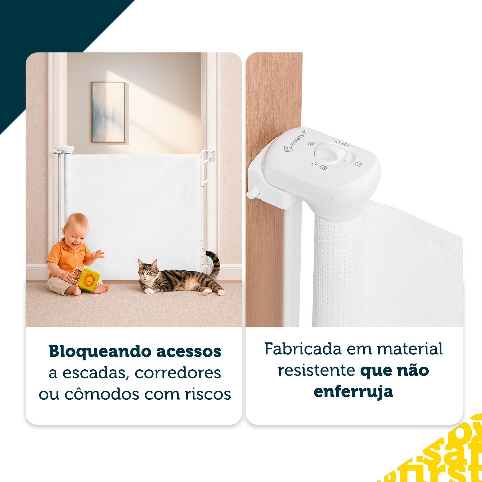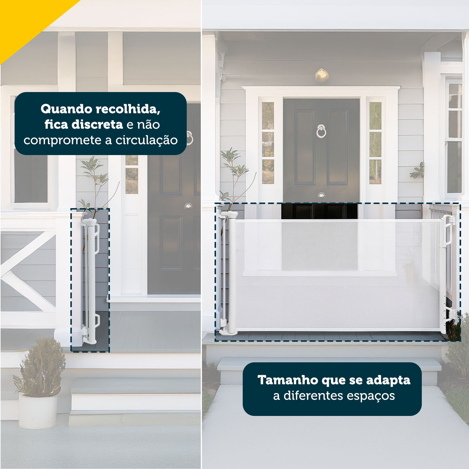 Essa é uma grade de segurança retrátil, muito resistente e durável feita em plástico, que não enferruja com o tempo. Ela possui um mecanismo retrátil que memoriza a largura quando aberta, tronando-se muito fácil fechar e abrir quando preciso. E sim, ela é totalmente a prova de exploradores: com um sistema de duplo travamento, ela assegura que somente adultos conseguem abrir.