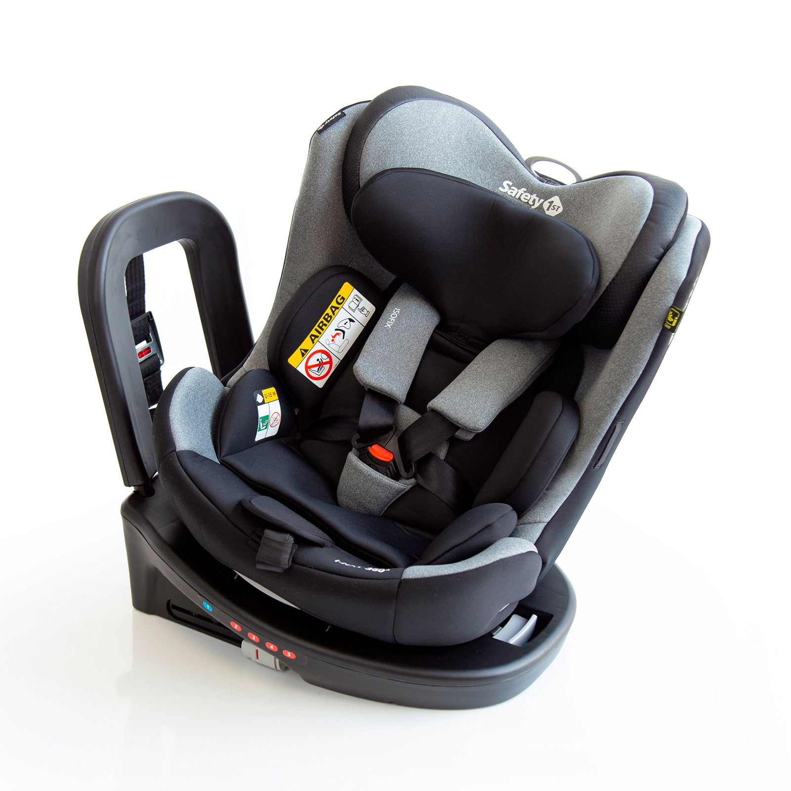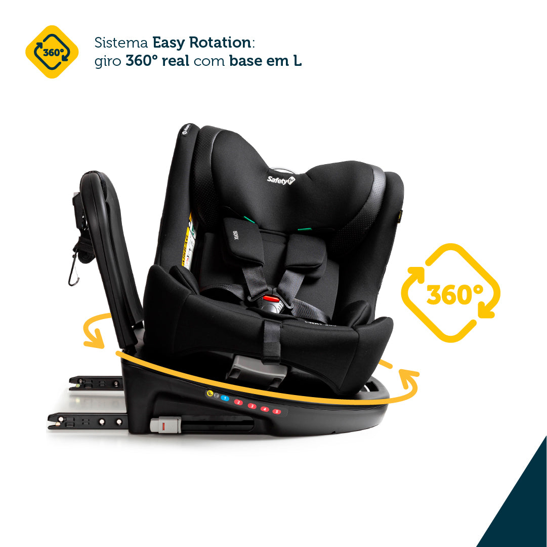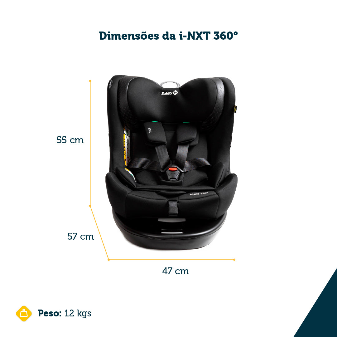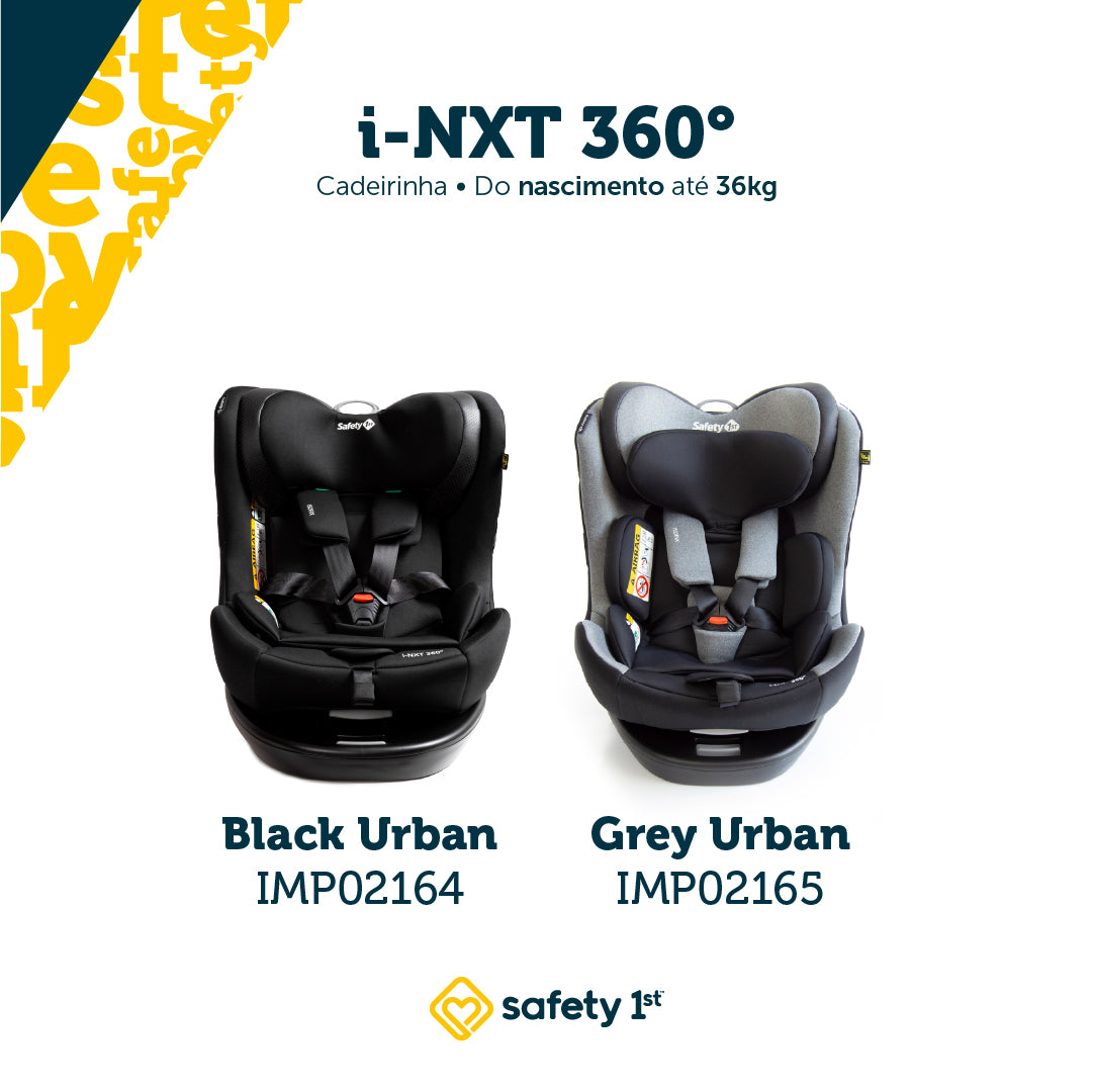 A cadeirinha i-NXT 360° da Safety 1st possui uma inovadora base em L e sistema Easy Rotation, o que permite o giro 360° real do assento, podendo ser virada para a porta do carro, para colocar e retirar a criança, em todas as fases, mesmo após instalada, isso é praticidade de verdade. O conforto da criança também é priorizado com o redutor acolchoado para recém-nascidos, desmontável, que tem formato adaptável ao crescimento e o ajuste das 5 posições de inclinação, que também pode ser feito, com a cadeira instalada, de acordo com as indicações para cada fase da criança. Os cintos de 5 pontos da cadeira, com protetores acolchoados e apoios elásticos nas laterais, para facilitar, ajustam-se simultaneamente ao apoio de cabeça e para uso por crianças acima de 105 cm e podem ser armazenados na própria estrutura, sem a necessidade de desmontar. Proteção lateral de impactos, tecnologia SafeSide®, testada e aprovada, para mais tranquilidade dos pais.