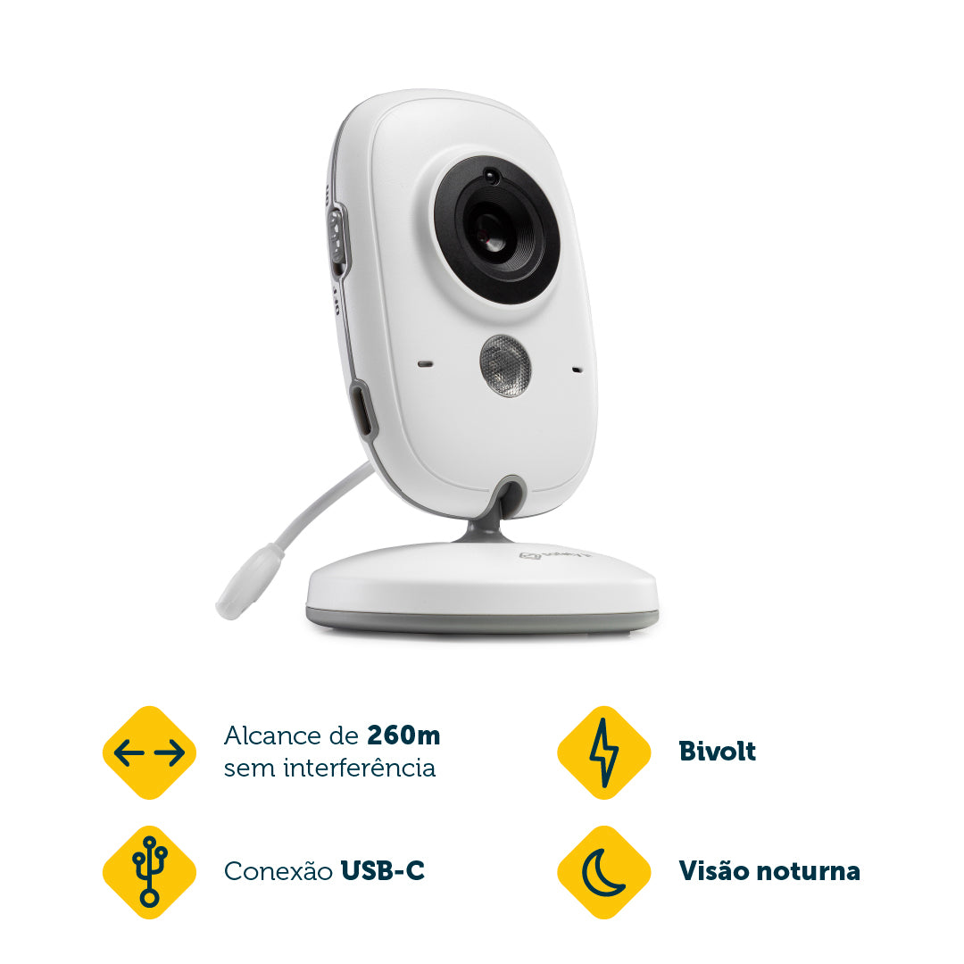 As noites também serão mais seguras e tranquilas com a Super Smart Vision. Ela possui visão noturna, sensor de temperatura do ambiente para garantir o conforto do bebê e 8 canções de ninar para um soninho delicioso. Com a tecnologia Talk Back, você consegue a distância falar com o bebê, que ao ouvir sua voz pode ajudar a tranquilizá-lo em noites agitadas. O acionamento por voz também facilita o monitoramento, acedendo a tela do monitor automaticamente mesmo com os menores ruídos.