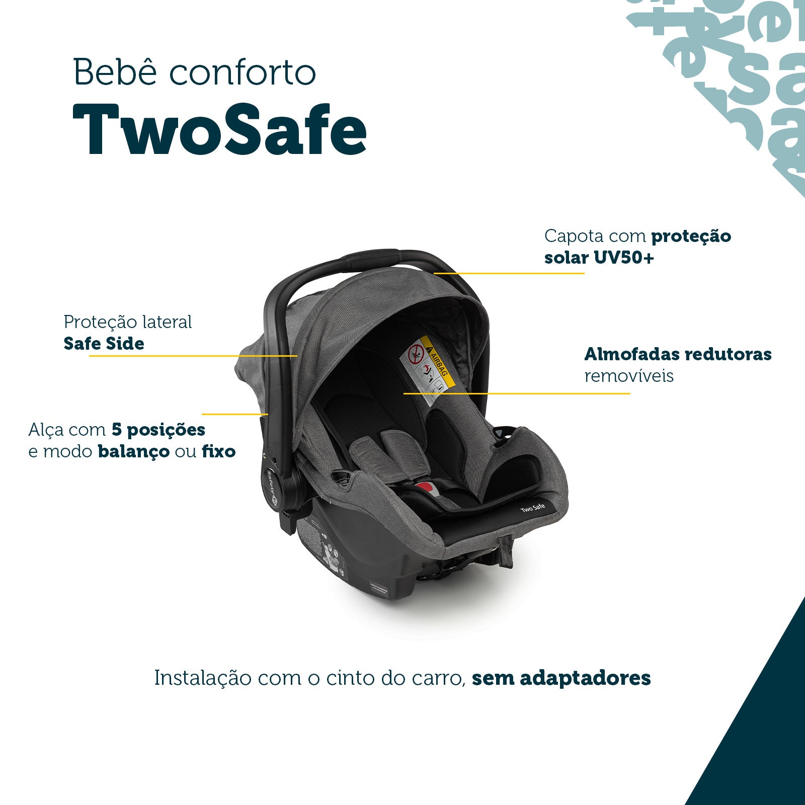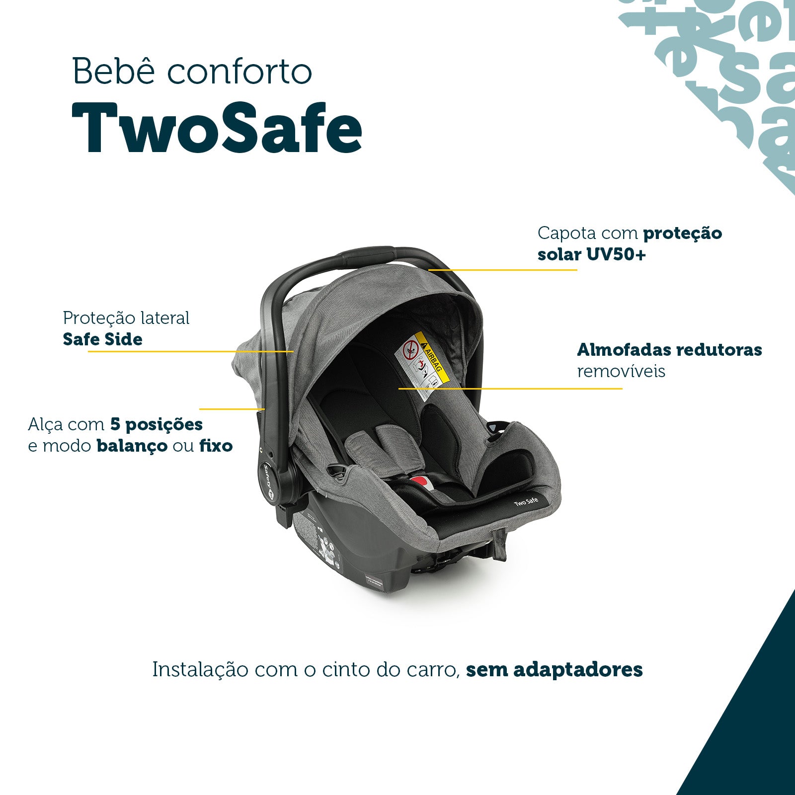 O bebê conforto Two Safe oferece proteção lateral com tecnologia Safe Side, capota com proteção UV50+ e almofadas redutoras removíveis, garantindo mais conforto e segurança desde o primeiro dia. A alça tem 5 posições e pode ser usada no modo fixo ou balanço, se adaptando à rotina. Além disso, sua instalação é feita com o cinto do carro, sem precisar de adaptadores.