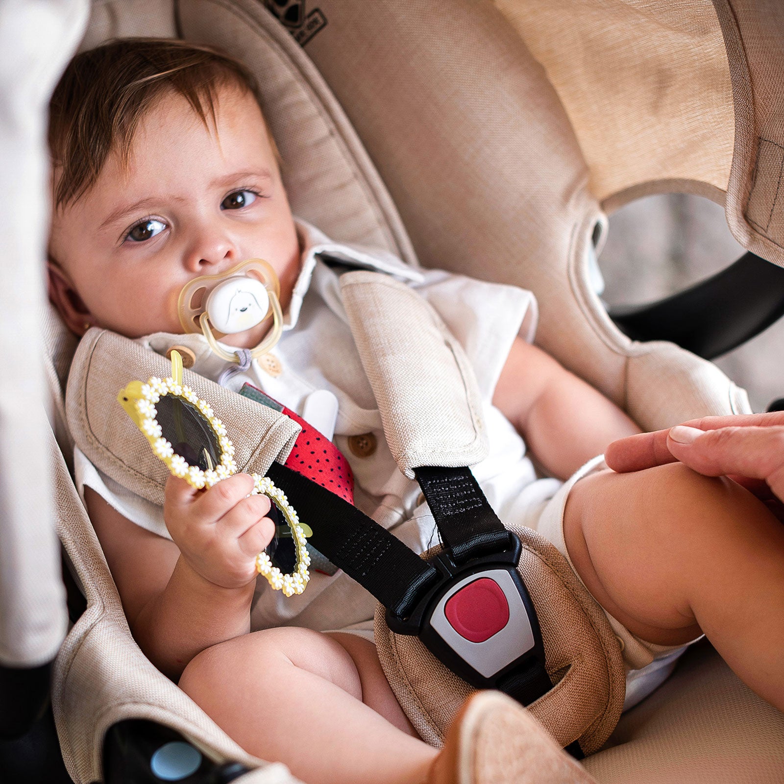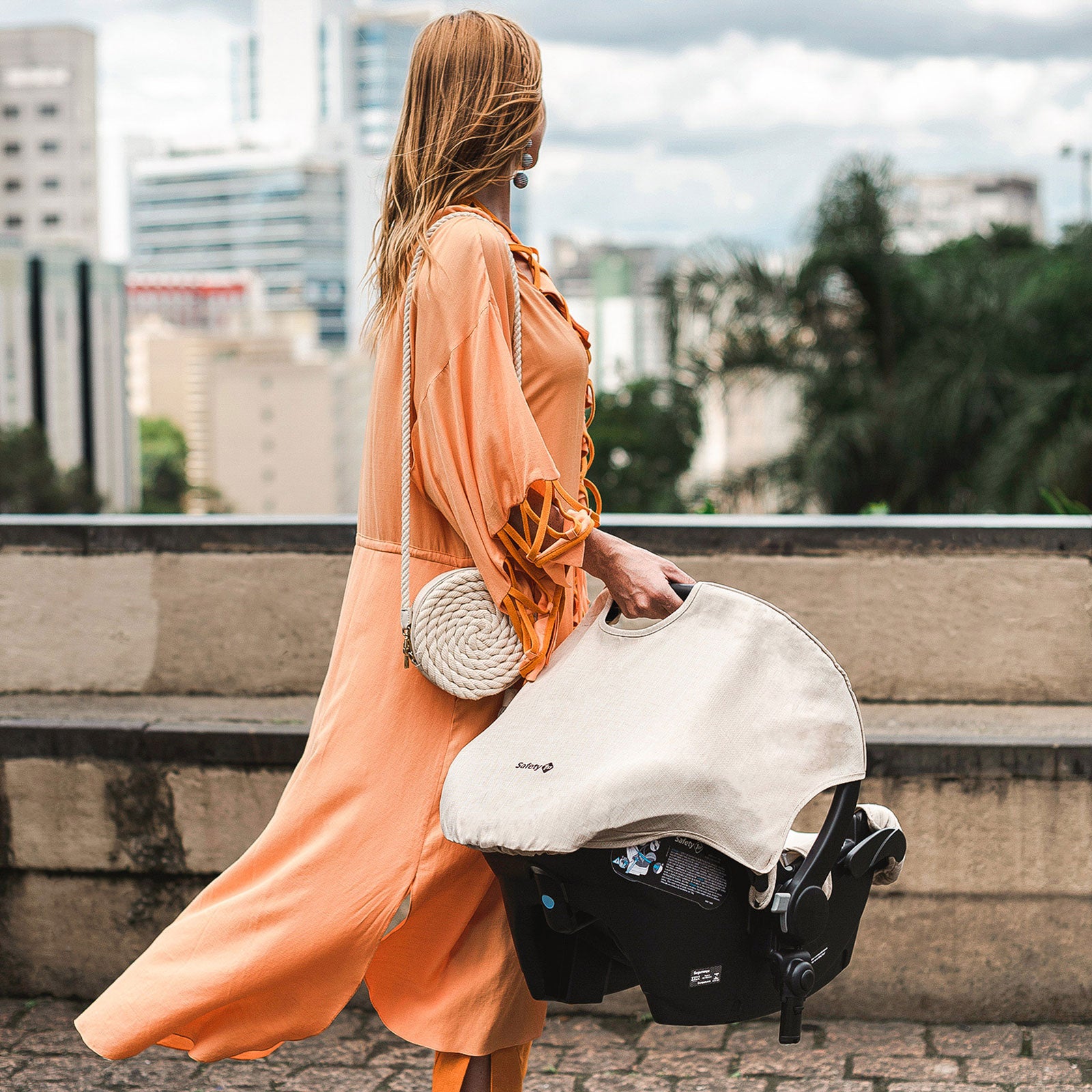 O One Safe é um bebê conforto completo: tem proteção lateral Safe Side, capota retrátil com UV50+, almofadas acolchoadas e alça com múltiplas posições. Pode ser instalado com cinto de 3 pontos do carro, sem complicação.