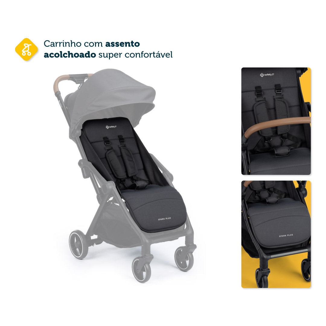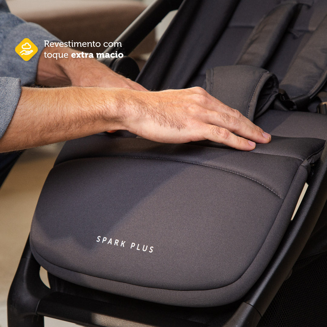 O carrinho Spark Plus foi criado pensando em aliar praticidade com muito conforto, sem abrir mão da segurança e do design moderno. É um carrinho confortável, seguro e muito prático! Ele possui um tecido extra macio ao toque e acolchoado especial no assento. Além disso, o encosto possui uma regulagem de até quatro posições de inclinação diferentes, que pode ser ajustada com uma só mão. O apoio de pés também pode ser regulado em duas alturas.