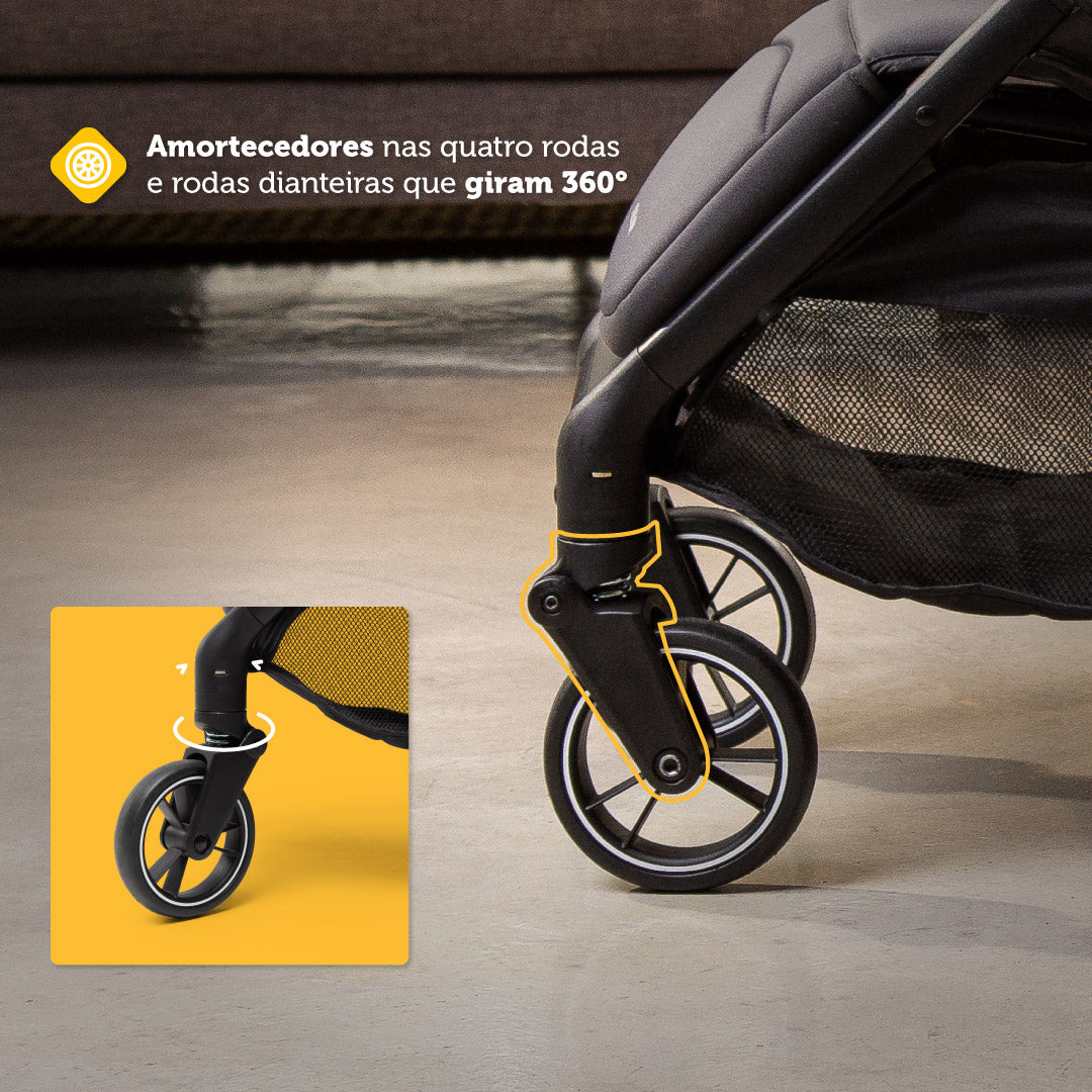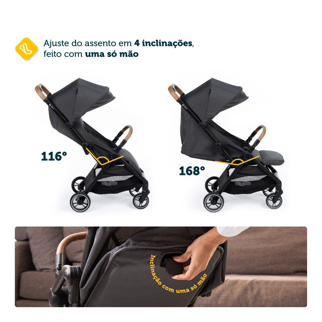 O carrinho possui adaptadores que se conectam perfeitamente com o bebê conforto 4safe. Ele também é muito confortável, com um revestimento que possui toque extra macio e almofadas redutoras acolchoadas, que permitem que o bebê fique em posição ergonômica correta.