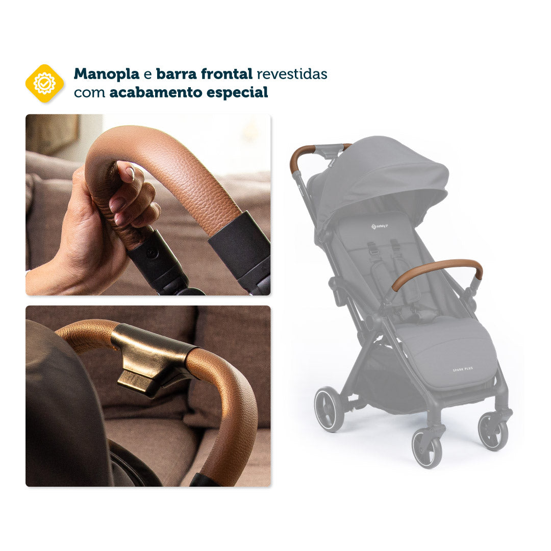 A estrutura do carrinho Spark Plus é feita em alumínio, deixando leve e fácil de transportar. Seu fechamento é automático, pode ser feito com apenas uma das mãos, e a barra frontal também é dobrável, o que permite que, quando fechado, ele fique mega compacto. Mas, mesmo compacto, oferece um cesto bem amplo para guardar o que for preciso. Tudo isso aliado a itens de segurança: o carrinho possui amortecedores nas 4 rodas, que torna o passeio em qualquer superfície mais suave, e também conta com cinto de segurança de cinco pontos, que se ajusta tanto na largura quanto na altura. O freio do carrinho é centralizado, o que ajuda na estabilidade, e as rodas dianteiras têm um giro de 360°.